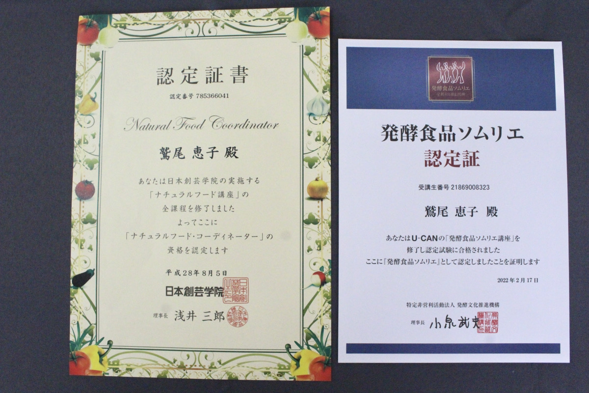 ナチュラルフードコーディネーター・発酵食品ソムリエの認定証書
